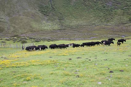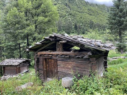 隨著海拔高度的升高與緯度的增加,一路上的植被類(lèi)型也在不斷發(fā)生著變化。穿越深闊的暗針葉林,六匹馬起起落落的腳力踩出了一個(gè)馬幫的回音,所有的植物在各自的生命活動(dòng)中散發(fā)出了清新怡人的芬多精,吉美為此小聲哼唱起了愉悅的歌兒,細(xì)聽(tīng)卻又像是兩只云雀在不遠(yuǎn)處鳴囀。再往上走,周遭的林木又轉(zhuǎn)換成了密致的高山杜鵑林,無(wú)數(shù)修長(zhǎng)的木流蘇垂掛在樹(shù)枝上,像哈達(dá)。一路沉默的南杰轉(zhuǎn)頭來(lái)開(kāi)始與我說(shuō)話(huà)“六月間,這里的每一棵樹(shù)都開(kāi)滿(mǎn)了粉白的花朵,一樹(shù)樹(shù)的煞是壯觀(guān)好看,我一個(gè)人經(jīng)過(guò),總能聽(tīng)到一朵、兩朵花鈍落的聲音。最初,我以為是馬雞飛落了,輕聲走入林中打探,身后又會(huì)落下一朵、兩朵花,那聲音厚重沉實(shí),林中又過(guò)于安靜,我就慌忙走出了林子......”南杰說(shuō)話(huà)聲音秀氣,我聽(tīng)得時(shí)斷時(shí)續(xù),過(guò)風(fēng)吹送著南杰話(huà)語(yǔ)中杜鵑花的香氣。前路逐漸敞亮起來(lái)的時(shí)候,路邊的杜鵑樹(shù)開(kāi)始變得稀稀落落了,只見(jiàn)路旁堆壘著高高低低的新鮮柴垛。再往上就沒(méi)有樹(shù)木了,只有矮腳盤(pán)香和淺草,路邊的山包上緊貼著密密麻麻的貌似多肉植物的草葉,從草心抽出來(lái)一枝枝薔薇紅的花柱在風(fēng)中頻頻點(diǎn)頭。雍貝在前方的馬匹上頭低得越來(lái)越沉,以為他瞌睡,我喊了聲貝,他回頭看我,面色灰白嘴唇有些發(fā)紫。南杰回望我們后一躍下馬,從路邊的淺草中折斷幾根盤(pán)香枝別在雍貝的耳際,說(shuō)是可以抵御高反。剩余的兩根遞給我,細(xì)小的枝葉上積著一層薄薄地灰色粉塵,深嗅有松脂的清香氣味,安人心神。