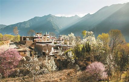 人面桃花相映,幾多唯美雅致,描繪出一幅藏鄉(xiāng)田園的世外靜謐祥和之美!