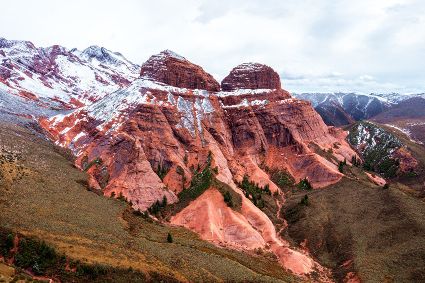 丹霞之美是無需雕飾的自然杰作。俯望之下,山體“色如渥丹,燦若明霞”,仿佛油畫創(chuàng)作中大筆涂抹的色塊,不加雕琢的姿態(tài)和毫不掩飾的奔放,展現(xiàn)了自然巨匠潛心創(chuàng)作的自信與率性。濃重的紅艷之上,稍覆冰雪之白,紅與白的碰撞如同冰與火的交融,于火熱熾烈間透出一抹冷峻肅殺。