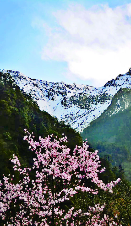 陽春三月,萬物復(fù)蘇,在這個(gè)春意盎然的季節(jié),雪白的梨花,正含苞待放,一切都生機(jī)盎然,再搭配藏寨與雪山,盡顯“雪域江南”的壯闊與秀美。