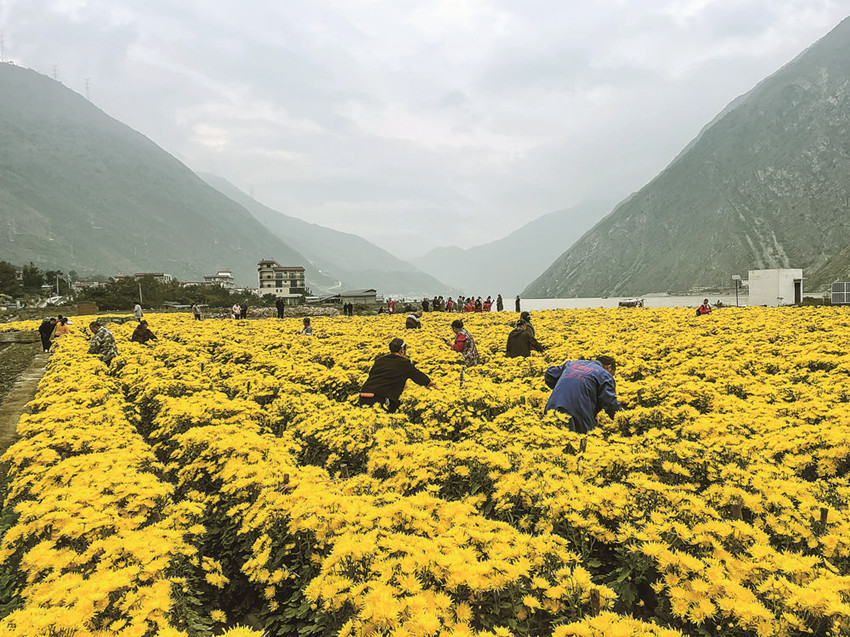 藍(lán)天白云,川藏第一橋下,金絲皇菊盛開,村民在菊田里忙碌著,靈巧的雙手在菊花叢中跳躍著,一幅田園畫卷映入眼幕。
