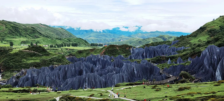 眺望石林恰如墨染,一條靈動(dòng)的飄帶穿溝渡嶺,蜿蜒于碧草野花之間。沿新修的步道,緩慢步入其中,才能真正感受到石林如同一片異世界。