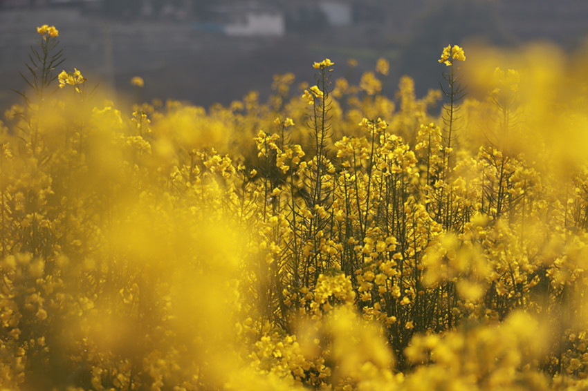 金黃的油菜花美美地填滿了整片田野,與藍(lán)天白云、村落人家相映成趣。順著田埂漫步花海,花香四溢,沁人心脾。微風(fēng)吹來,一朵朵油菜花在風(fēng)中搖曳,嬌嫩的花蕊隨風(fēng)飄動,仿若身著金黃色輕紗的少女在翩翩起舞,靈動迷人。在花叢中飛舞的蜜蜂為花田增添了靈動和生氣,一掃冬日的沉悶,帶給人明快舒朗的好心情。成片盛開的油菜花與前來賞花的游人相映成趣,游人們拿出手機(jī)、相機(jī),尋找最佳的角度,定格醉人美景,讓人忍不住贊嘆:好一番田園美景。