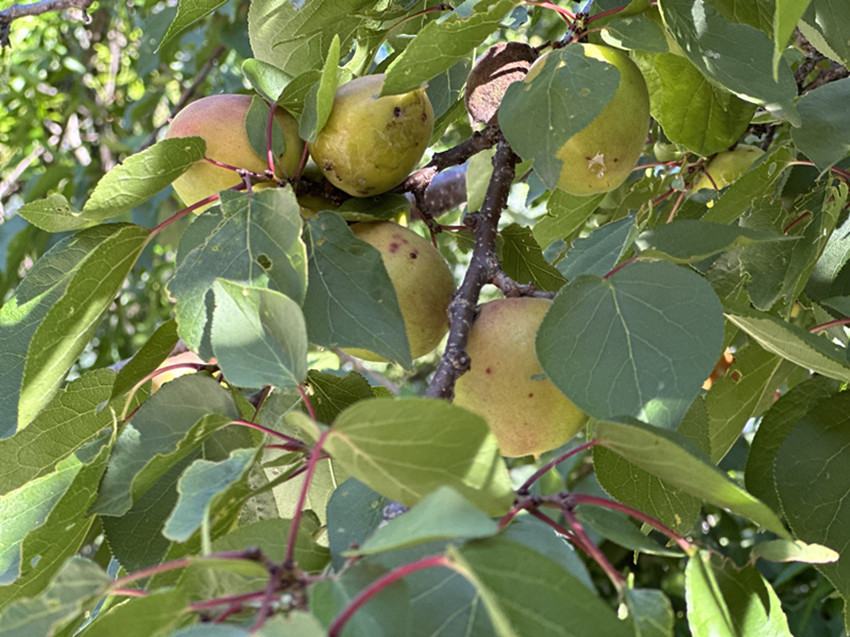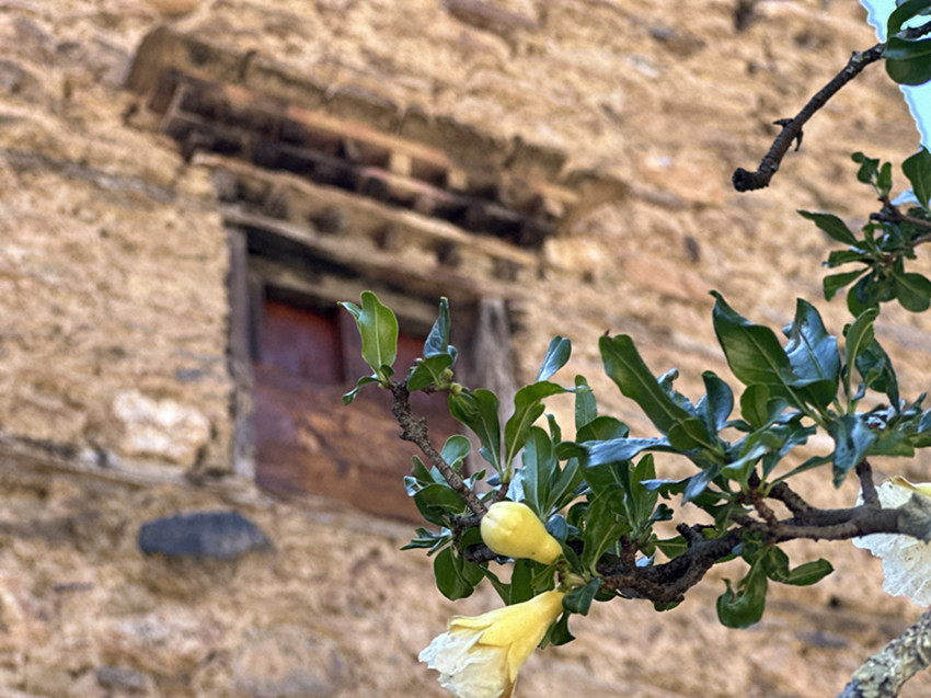 彩色鋪裝的通村路兩邊,成片的苞谷林正在背紅纓,風中響著緊密結(jié)實的聲音。各種果木枝繁葉茂,結(jié)滿了寶石般紅紅綠綠的果子。一排柴垛上方,伸出很大一片橙色的小果子,沒有葉子,我們像賞花一樣欣喜于它的紅艷。嘉絨姑娘悄默地走在我們身邊,她的手里擺弄著一片草葉,安靜而美好,是感到這一路上的莊稼果木已經(jīng)足夠繁盛。