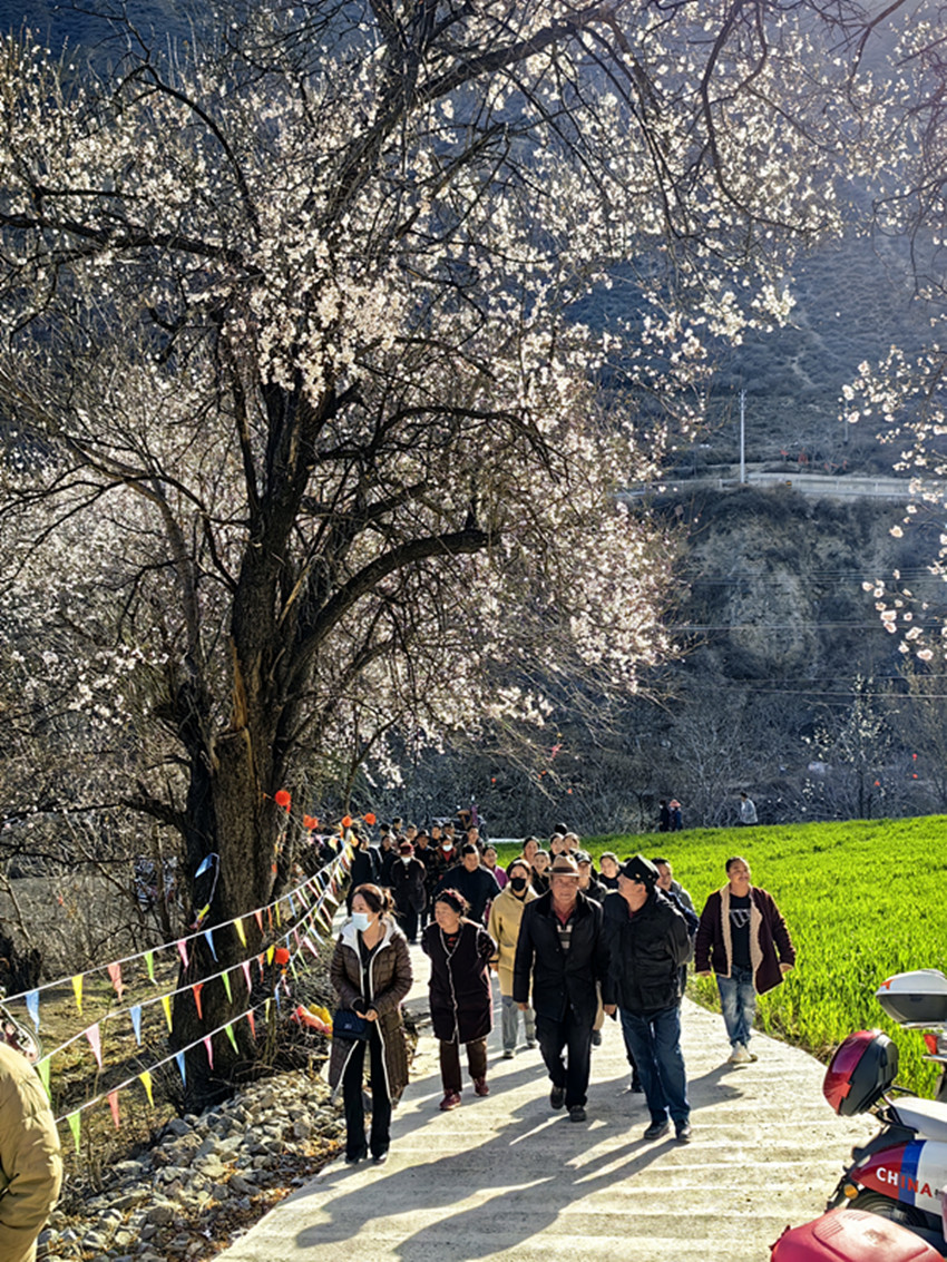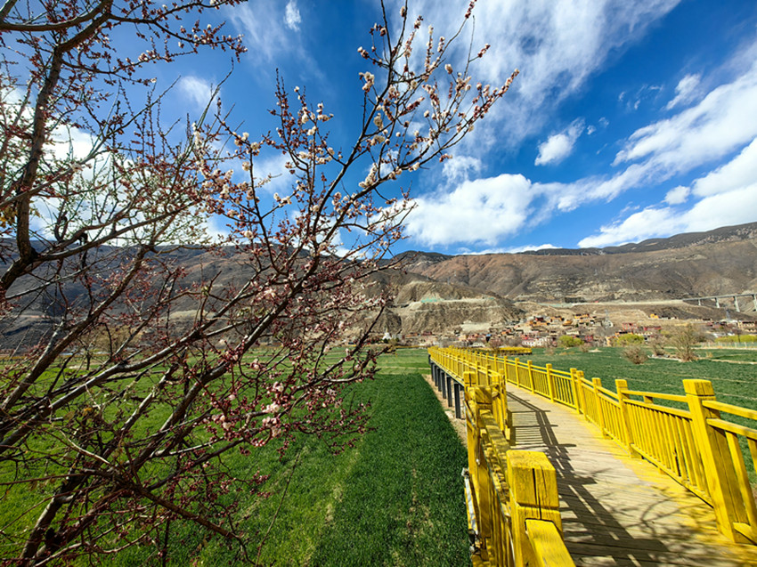 春意枝頭俏,桃花競(jìng)相開。登高遠(yuǎn)望,巍峨青山綿延,山腳麥苗蕩漾,蒼茫山色間,一株株、一叢叢野生桃花星羅棋布點(diǎn)綴其間,加之一棟棟別致藏房掩映其中,春的美麗畫卷就此鋪展開來(lái)。