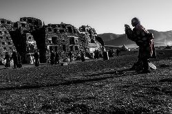 石經(jīng)城位于距石渠縣城呢呷鎮(zhèn)東北約90公里處的阿日扎鄉(xiāng)境內(nèi),坐落在雅礱江支流洛曲河西岸一處兩山相望的草原間,背靠一座平緩、渾圓的山丘,前面是一望無際的草原,由于草原極為遼闊,遠遠望去,整座城并不顯得特別雄偉、壯觀,但走近細(xì)看,這座用一塊塊刻滿經(jīng)文和佛像的石片、石塊在漫長歲月中逐漸壘砌起來的石城,所蘊含的厚重與蒼茫,堅韌與神秘,讓我想起荷爾德林所說的“那些四處飄游的分散的力量,都匯聚在一個黃金般的中心”。
