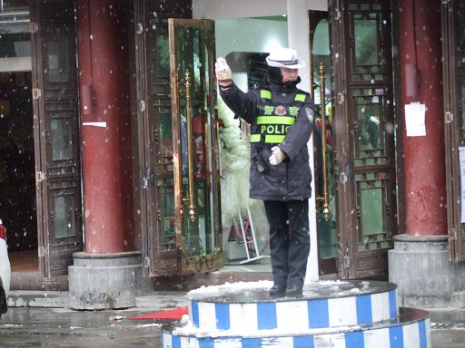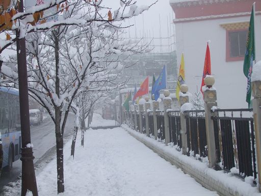 康定秋意正濃,河岸的楊柳還未泛黃,卻意外地迎來了一場不期而遇的降雪,也是今冬康定迎來的第一場雪。大片的雪花輕盈落下,康定城和跑馬山一片銀裝素裹,分外妖嬈。13日早上,康定城依然下著鵝毛大雪。這場深足30厘米的雪,使入冬以來一直持續(xù)的干燥空氣變得濕潤,雪景美不勝收,但也給人們出行帶來許多不便。記者在街道上看到車流量和行人明顯減少,機動車都放慢了速度,以確保行車安全。上學(xué)的學(xué)生,上班的人群都都裹上了厚厚的冬裝,小心翼翼地行走在雪地上。交警依然堅守在紛飛的風(fēng)雪中指揮交通;環(huán)衛(wèi)工人和一些單位職工迎著大雪清掃馬路和庭院積雪。記者提醒司機,雨雪天氣謹(jǐn)防交通事故,行人要注意因雨雪路面濕滑,謹(jǐn)防摔傷。