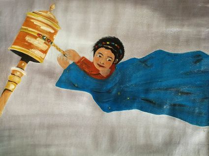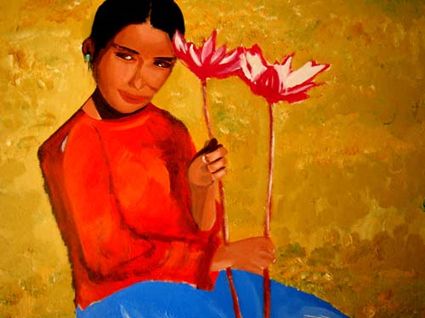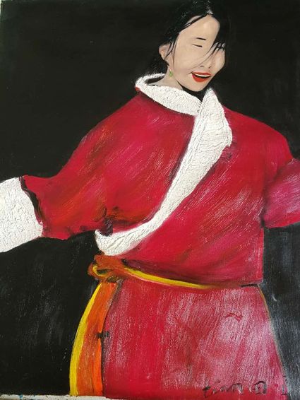 畫畫三年多了。十三歲寫詩;到了高原后,方開始創(chuàng)作長篇小說。在上海,我做過畫廊。但要說斗膽動筆畫幅肖像。我是在白度母唐卡前燃了三炷香的。包括在咖啡店現場作畫。到京城繼而國外辦畫展,我認為都是因了我把畫布當成了詩稿的緣故。于是,大家喜歡我這種野路子,天馬行空,可又不舍方圓的創(chuàng)作手法。接下來,歐洲、東京還會有我的系列展覽。