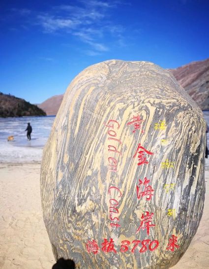 在木格措(野人海)的左邊就是被譽(yù)為“愛(ài)情灘”的黃金沙灘,很多有情人在這里許下愛(ài)情的誓言,草木生靈都作為見(jiàn)證。圍繞海子自然形成的沙灘在高原是很罕見(jiàn)的,當(dāng)春天來(lái)臨,冰面漸漸舒展開(kāi),浪花也席卷而來(lái),在黃金海岸,你可以逐浪玩沙。