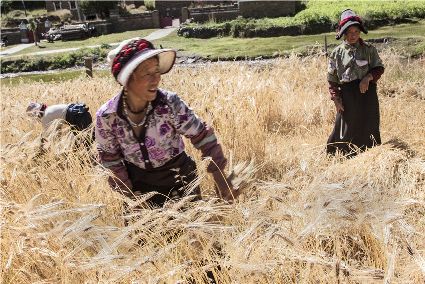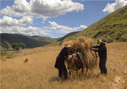 八月起迄,當(dāng)你翻越西出爐關(guān)第一隘口的折多山,下山十里就會(huì)看到山地田野里成熟的青稞、麥子象展開一頁(yè)頁(yè)金黃的詩(shī)篇涌進(jìn)眼里。那大地山坡起伏驛動(dòng)的金箔等待著走進(jìn)主人的碉樓……這個(gè)時(shí)候,正是秋收的開始。