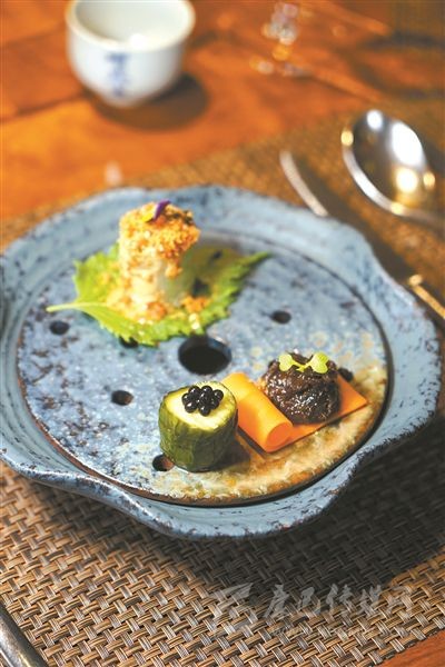 在不少素食店里,廚師會充分利用當(dāng)季食材,不時不食的廣府飲食理念也更為凸顯。慈姑、金桔都是春季的食材,因此被天水蔬食料理運用到“雨水”節(jié)氣的菜單里。據(jù)店長介紹,慈姑是生長于水中植物,如同土豆一般軟糯。廚師用南乳和腰果做成堅果醬,作為慈姑的配搭醬料。慈姑被切成片,中間夾著梅菜,再用堅果醬“粘合”起來,還原慈姑原本的形狀,再通過烤箱烤制,再配搭撒上意大利黑醋的臺山花菜,口感豐富。金桔用來做甜品,將金桔挖空,里頭放入一個核桃,表面再鋪上一層風(fēng)干的金桔果干,做成一件小巧甜品“金桔核桃糖”,其設(shè)計靈感源自廣東金桔糖。與它一同出場的還有用金桔果肉打醬做成的金桔年糕,也十分甜美。