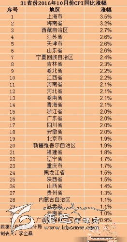 在31個省份中,上海10月份CPI漲幅全國最高,為3.5%,漲幅比9月回落0.1個百分點(diǎn)。其次是海南,漲幅為3.2%。上海、海南也是目前全國兩個CPI漲幅處于“3時代”的地區(qū)。