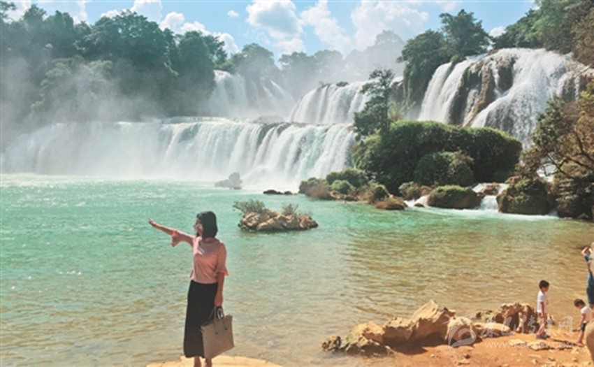 游客在廣西大新縣德天瀑布景區(qū)留影。獨(dú)特的景色使德天瀑布“十一”期間吸引了眾多游客。斯 諾攝