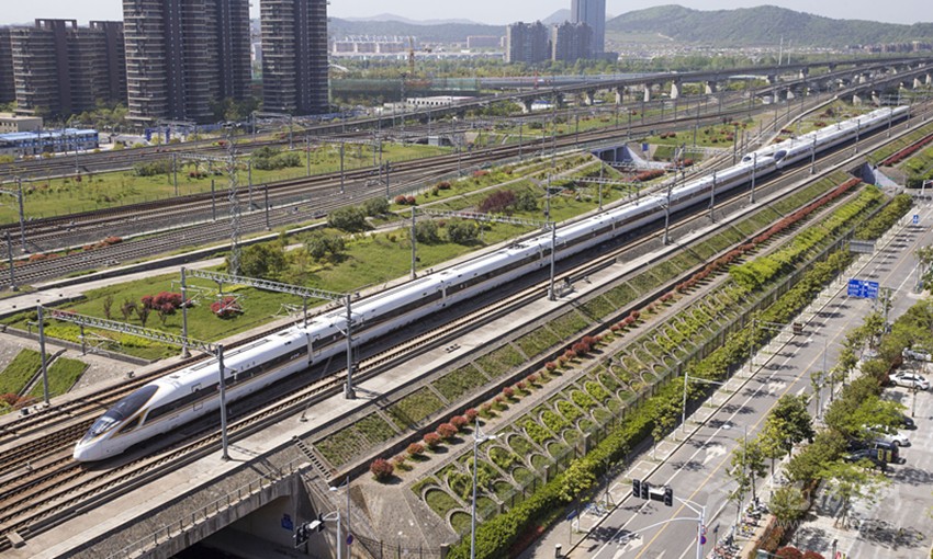 一列“復(fù)興號”動車組列車行駛在京滬高鐵南京市境內(nèi)。 新華社發(fā)