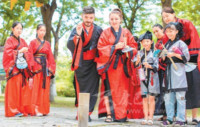 浙江省長興縣陳武帝故宮內(nèi),外國游客和學(xué)生們一起體驗(yàn)投壺游戲。