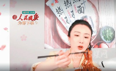 在人民日報新媒體“為鄂下單”系列直播湖北團(tuán)圓專場,網(wǎng)紅主播正在展示湖北特色食品熱干面。