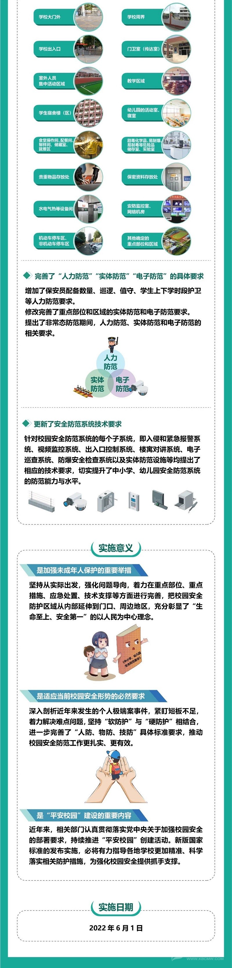 《要求》的突出亮點(diǎn)是,明確安全防范的重點(diǎn)部位和區(qū)域。堅(jiān)持以“生命至上、安全第一”為中心理念,結(jié)合近年來國家和相關(guān)部門對中小學(xué)、幼兒園安全防護(hù)工作的系列部署以及校園的不同類型、規(guī)模,明確了安全防范的16個(gè)重點(diǎn)部位和區(qū)域,把校園安全防護(hù)區(qū)域從內(nèi)部延伸到了門口、周邊地區(qū)。