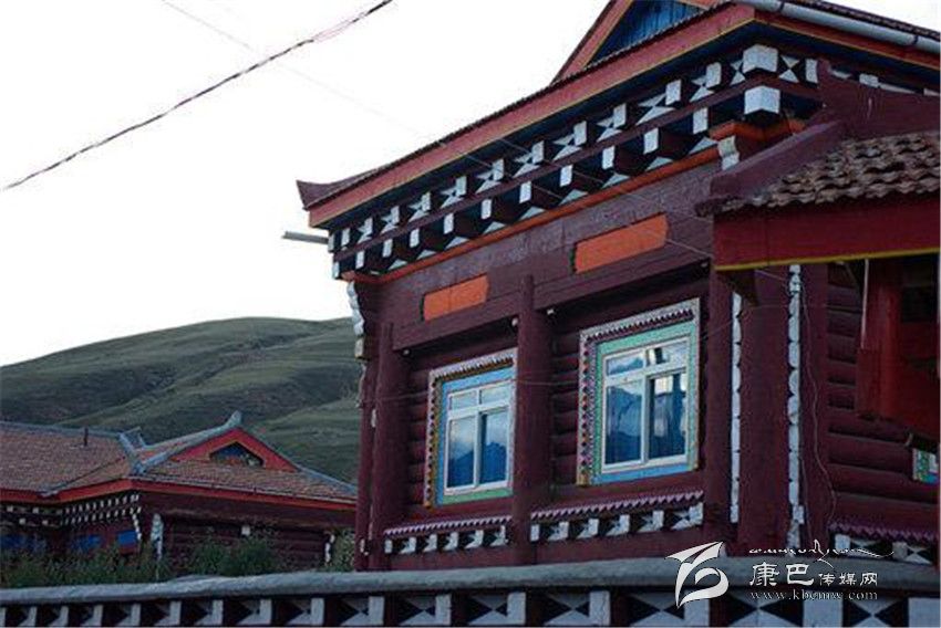 道孚民居的一般結(jié)構(gòu)是以藏式木架穿逗,作為整體骨架,一般為二、三層;以片石或泥土砌墻,按正方形各邊7-10尺為空間立柱,四柱之間稱一空,一般房屋有16-30空,也有40、50空的。柱與柱之間有穿枋或原木鎖拉扯,其余維護(hù)結(jié)構(gòu)由橫向平置,圓弧朝外的對(duì)剖圓木組成,它們層層重疊、四角交叉相搭,房頂高約5至8米。比起改進(jìn)前,柱子直徑普遍加大,豪宅的柱子需兩人合圍,給人一種穩(wěn)重之感;底層和二層的木柱連體,并仿照內(nèi)地建筑的木穿逗式結(jié)構(gòu),梁柱接榫,形成一個(gè)牢固的整體,以增強(qiáng)抗震能力。外形多為四方形,二樓呈L形、凹形或回形,內(nèi)層結(jié)構(gòu)是純木材,架“棒柯”或“棒勒”,間隔為各種用途的房間。房間上裝木望板,下鋪木地板,頂蓋用樺樹(shù)皮或硬雜木條墊底再鋪“阿嘎土”,日曬雨淋絕不漏水。屋架門窗外表的裸露部分,則多以油漆或自制的有色土染過(guò),既防腐防蛀,又美觀大方。從外部看,二層平臺(tái)的女兒墻上,種滿了各種花草,房前屋后還種植了果樹(shù)。用泥土夯筑的底層和二層后方的土墻刷成白色,而木質(zhì)的半圓木墻體涂成褐紅色,窗框和窗扇均作彩繪,室內(nèi)裝飾也都用紅色等“火熱”的基調(diào)。各種色彩相互協(xié)調(diào)映襯,給人的印象特別深刻。