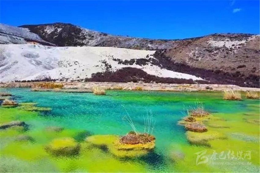 泉華灘海拔約4000米,屬于高山河谷草甸地貌。東南面就是貢嘎山,這里是觀看“蜀山之王”的絕佳位置。它因一種含有大量化學(xué)物質(zhì)的泉水在地表產(chǎn)生化學(xué)沉淀而成,從另一個(gè)山頭傾斜下來大片的白色鈣化土,延伸到谷底后便變化出四層五彩的鈣化池。每個(gè)階地上有十幾個(gè)大小不同、形態(tài)各異的五色彩池,水深40-70厘米,彩池里水草相依,石花點(diǎn)點(diǎn),疑為瑤池降臨人間!