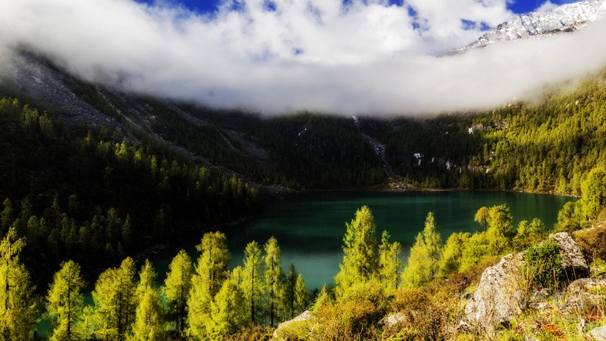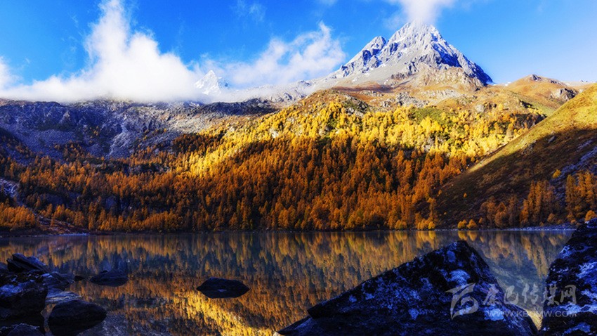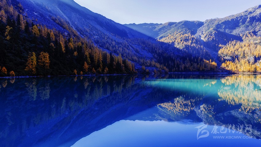 深秋季節(jié),騎馬上山,穿過彩色秋林來到湖邊,但見雪山腳下,層巒疊嶂,落葉松間,一池秋水像一顆純凈的寶石,鑲嵌在嶙峋陡峭的高山峽谷中,偎依在茂密的原始森林旁,湖水倒映著藍(lán)天白云和金黃的落葉松,靜謐而神秘,散發(fā)著迷人的光芒。這里沒有絲毫人工打造的痕跡,這里沒有一點人間煙火的味道,這里就是一方充滿誘惑的世外桃源——道孚甲依拉措。