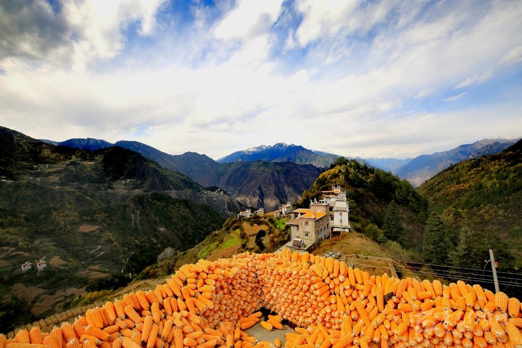 丹巴的村寨呈現(xiàn)出一派多彩的畫(huà)面。在甲居藏寨,山寨依山面水,紅白相間的民居從大金河谷層層疊疊向上攀援,錯(cuò)落有致地散布在山坡上;在中路藏寨,云霧繚繞,目光所及之處皆是晾曬的豐收?qǐng)鼍埃r紅的辣椒與黃澄澄的玉米勾勒成一幅田園牧歌畫(huà)卷。
