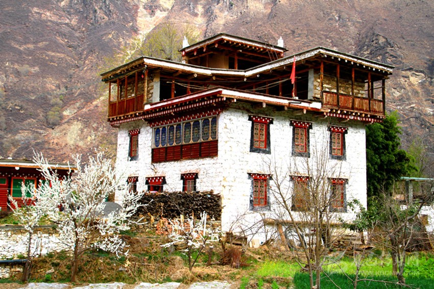 藏寨的梨花,并非成片的生長(zhǎng)在一起,它們散落在村民的田間地頭和房前屋后,老干虬枝,滄桑感十足,仿佛是一個(gè)個(gè)“時(shí)間老人”,守望著藏寨的幸福變遷。