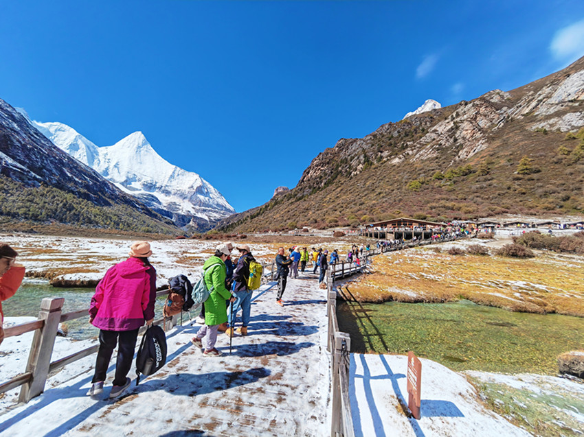 在三怙主神山、牛奶海、五色海、珍珠海、沖古寺、洛絨牧場等景點(diǎn)處,游客們絡(luò)繹不絕,忙著感受和記錄亞丁的初雪。