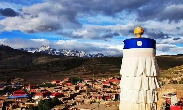 沿著甘孜縣城門向東南一望,一座37米高的大寶塔便呈現(xiàn)在你的眼前,寶塔其底三層寶座均北京天壇祈年殿座底比列大小而建。雄偉壯觀。