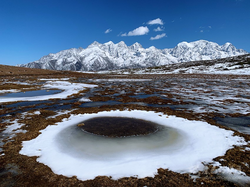 迷魂凼可以看見貢嘎衛(wèi)峰五色山系及貢嘎主峰周邊的愛德嘉峰、嘉子峰、日烏且峰和小貢嘎。在季節(jié)性小湖邊,湖面倒影著雪山,仿佛一幅絕美的風(fēng)光畫,走進(jìn)其中,便成了畫中的一部分。