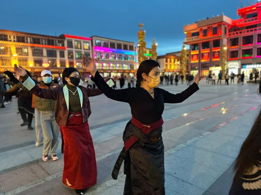 本網(wǎng)訊 每到傍晚時分,色達(dá)的金馬廣場上都會準(zhǔn)時響起起歡快的鍋莊曲。 舞者們雙手隨音樂自然張開,邁著輕快的步伐,踢腿、揚手、轉(zhuǎn)圈。游客們有的拿起手機拍照留念,有的則加入鍋莊舞的隊列。