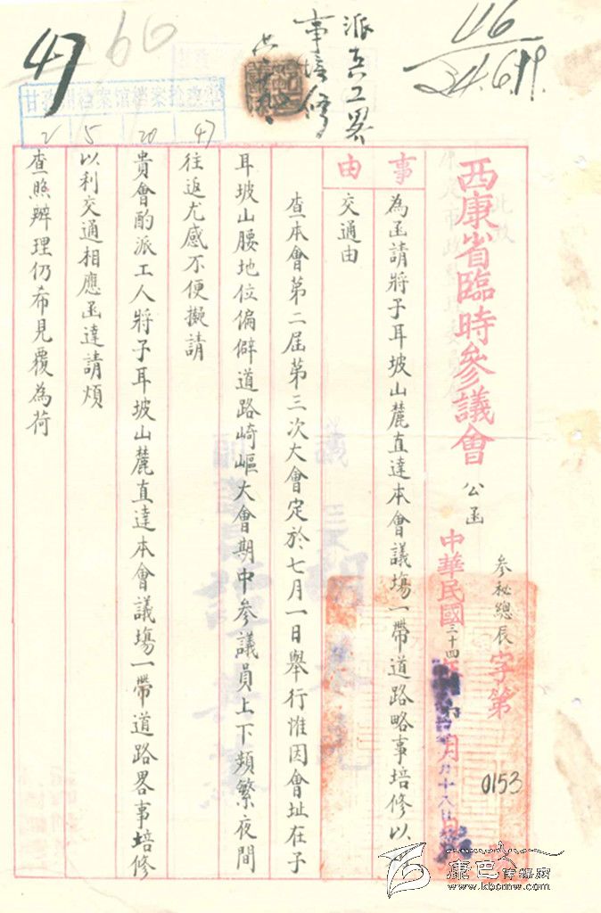 1938年,在子耳坡山腳、如今的州委黨校的地址上,“西康省建省委員會”修建了一幢本意是用來作為接待過往達官貴人的“籌邊別墅”。這是幢一樓一底的木石結(jié)構(gòu)建筑,當年是康定城最氣派的建筑。1939年,西康省臨時參議會成立,沒有會址,沒有辦公地點,新成立的西康省政府便把“籌邊別墅”撥給西康省臨時參議會作為會址。但是要從城里走到子耳坡山腳,最近便的道路是從中橋附近轉(zhuǎn)到當時的茶店街(現(xiàn)在的建設(shè)路靠東的一段),再沿山往上行。由于是土路,亂石遍地,不好走。于是,當時的參議長胡恭先親自動筆,至函“西康省會市政建設(shè)整理委員會”要求整修這條小道。這里的文字檔案記載的就是這件事。
