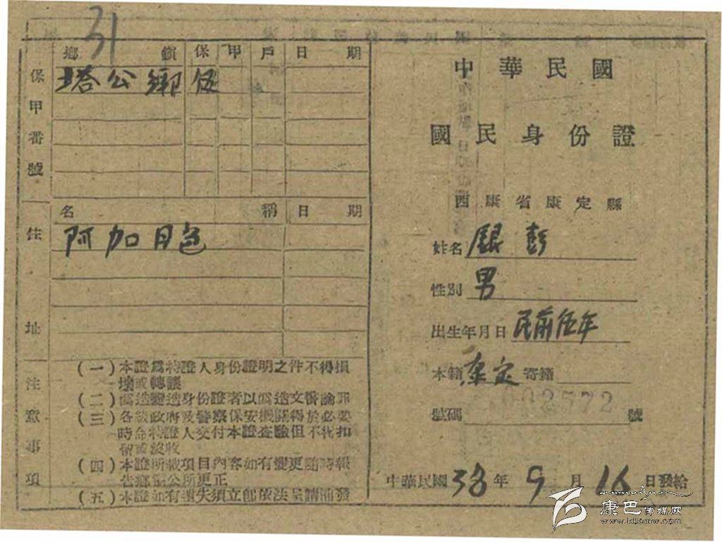民國33年,即1944年,西康省民政廳制定《康區(qū)戶口清查辦法》,決定正式清查西康全省戶口。民國35年,即1946年,康定縣政府對康定全縣人口進行統(tǒng)計。在1946年時候,全康定縣共8622戶、36797人,其中男性20889人、女性15908人(不含后重新劃歸康定管轄的所謂“金湯自治局”部分)。爾后開始發(fā)放“國民身份證”。發(fā)放工作斷斷續(xù)續(xù),延續(xù)數(shù)年,有的人領(lǐng)到,也有的人根本就沒看到過這種“國民身份證”。