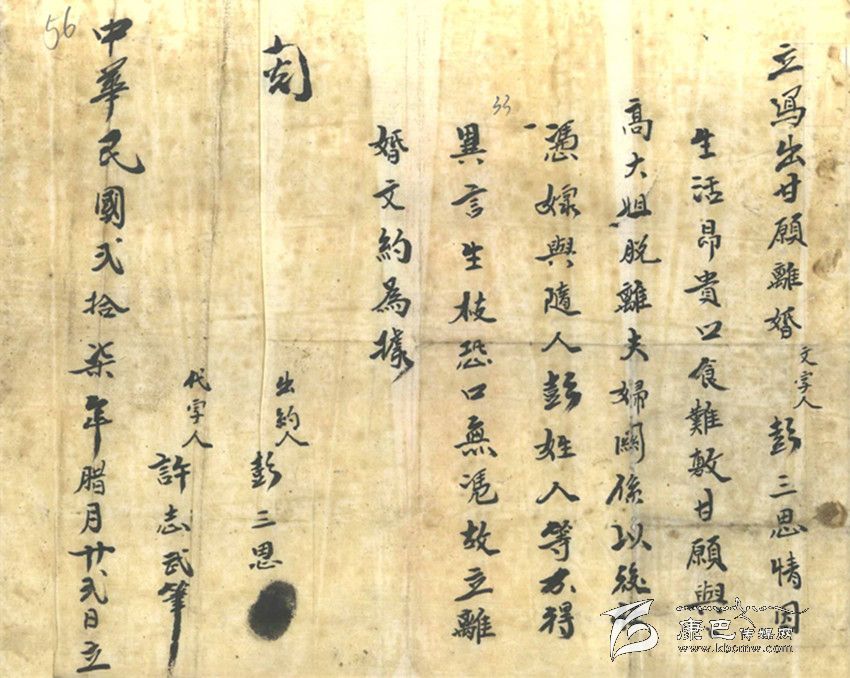 在這張“離婚文約”上看不出女方的任何態(tài)度和意愿,她仿佛只是一個(gè)影子,沒有了光源,影子也就不會存在。這位姓彭的男子雖是窮極潦倒之輩,身處社會底層,卻還是擁有對更為弱勢的曾經(jīng)是自己的妻子“要還是不要”或者是“放與不放”的特權(quán)。