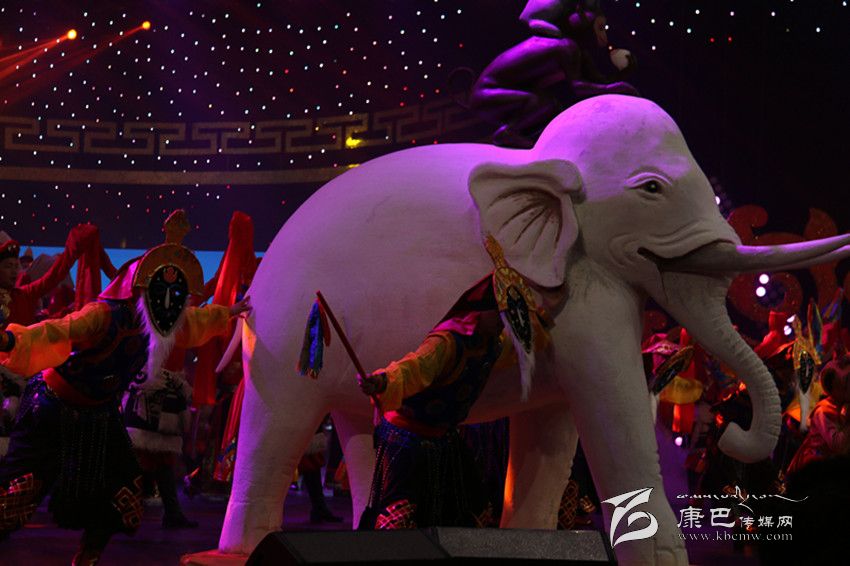 此次藏歷新年春晚被命名為“圣潔家園”,為了應(yīng)“家園”這個(gè)景,導(dǎo)演組頗有“心機(jī)”的將藏元素“和睦四瑞”搬上了舞臺,在開場舞中,兩個(gè)用石膏打造的、栩栩如生的“和睦四瑞”被演員緩緩?fù)粕衔枧_,贏得觀眾陣陣歡呼。在民間傳說中大象、猴子、白兔、貢布鳥共同發(fā)愿行持善法,貢布鳥鼓勵(lì)同伴們開始持守五戒,并一直堅(jiān)持不懈動(dòng)員其它眾生嚴(yán)守五戒。在它們帶動(dòng)、勸說下,動(dòng)物們都能漸漸做到互不損害、如理如法在木森林中和平度日,以其厲行善法之因,天人也降下和合雨水。后來,整個(gè)大地之上,莊稼豐熟、植物茂密、鮮妍之花滿目盛開,整個(gè)國家喜獲豐收、財(cái)富圓滿。晚會也是想利用“和睦四瑞”寓意人民生活團(tuán)結(jié)和睦、和平寧靜的美好愿望。