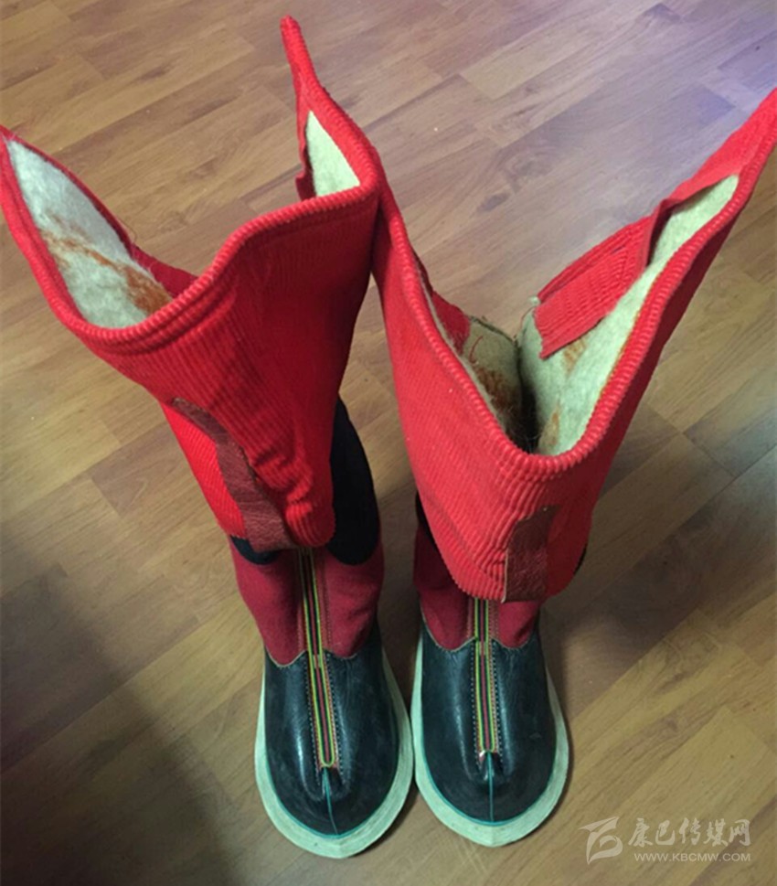 藏靴,是藏民不可缺少的用品,靴子的原料為牛皮,用較厚的牛皮作底,薄一點(diǎn)的作面,底和面的縫合則用牛羊皮條,鞋口前端還有帶毛的牛羊皮裝飾。從外觀上看類似舞臺上古裝戲里將相穿的靴子,靴子內(nèi)里有毛絨,既暖和又舒適,鞋腰還配有由氆氌等原料制成的各類樣式的線條、花紋。