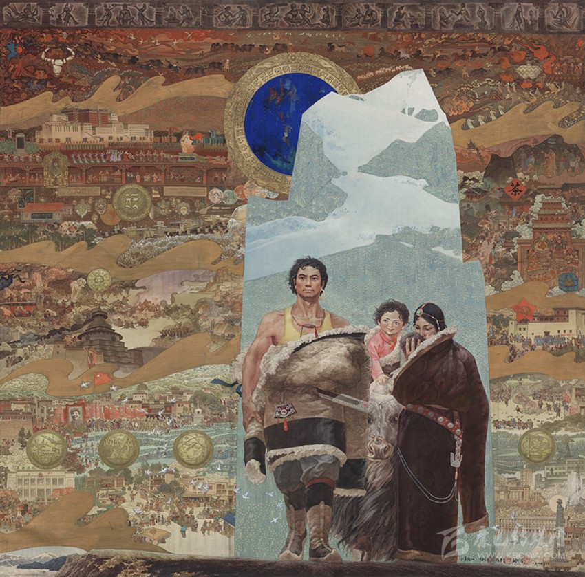 15世紀(jì)以來,唐卡發(fā)展所恒定的兩個(gè)元素:一是平面構(gòu)圖的神佛之境,另一則是吸收大青綠山水精髓。正如DNA鏈的雙螺旋結(jié)構(gòu)一般,使唐卡繪畫在歷史時(shí)空中穿插縈繞,在雪域各地生根開花。到了公元20世紀(jì)初,照片的高度寫實(shí)促使藏地畫家邁出了革新步伐,使得唐卡繪畫逐漸擺脫傳統(tǒng)束縛,開啟了“人”的覺醒。衛(wèi)藏地區(qū)出現(xiàn)了“根敦群培、安多強(qiáng)巴”引入寫實(shí)主義的嘗試,成為當(dāng)今西藏“布面重彩”的先驅(qū)。新中國(guó)成立后,內(nèi)地的美術(shù)創(chuàng)作積極影響了三大藏區(qū)的繪畫發(fā)展,上世紀(jì)80年代,四川康區(qū)“甘孜藏畫”肇起,在《嶺·格薩爾王》人文主義的召喚下,《雪山兒女》《唐東杰布》《新概念唐卡》正從歷史深處一路走來。而近年來,安多藏區(qū)則創(chuàng)新出了“藏族祥巴版畫”,祥巴版畫不僅是從材料技法上對(duì)西藏繪畫的豐富,更是藏地畫家們?cè)谧杂X不自覺的求新、求變;甚至在傳統(tǒng)唐卡領(lǐng)域,民間畫師也都在紛紛嘗試將傳統(tǒng)唐卡和現(xiàn)代審美相結(jié)合。這一切,正是唐卡繪畫從傳統(tǒng)走向現(xiàn)代、由宗教博衍至生活的演變過程,在這個(gè)過程里,藏地畫家不僅在畫面的形式和語言上完成了傳統(tǒng)與當(dāng)代的統(tǒng)一,還將西藏的審美特質(zhì)虹化為作品的精神內(nèi)核。這也是唐卡藝術(shù)第二次“從香巴拉到人間”的過程,成為民族文化發(fā)展的新坐標(biāo)。