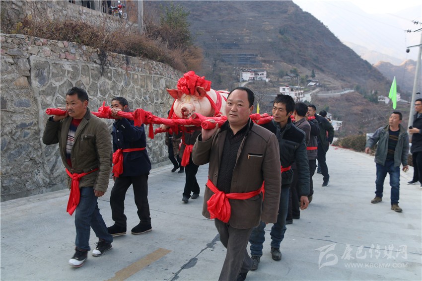 5個村民將年豬抬到秤上。360斤。村民為年豬準備大紅花。準備紙錢、香蠟。9點整,殺豬匠開始了他的工作,在眾人齊心協(xié)力下,光溜溜的年豬被打整干凈。“保佑我們村來年風調(diào)雨順、五谷豐登,村民平安健康?!贝逯欣险呔催^天地后,8個身強力壯的村民站在年豬旁,豎著拇指齊聲說,今年家家戶戶還要養(yǎng)大肥豬。抬著年豬,村里的中老年人簇擁著,走在最前面,唱著悅耳的民謠,大意是歌唱幸福生活的,迎著2018年的第一縷陽光,村民們喜氣洋洋。到村里來的游客蜂擁拍照。
