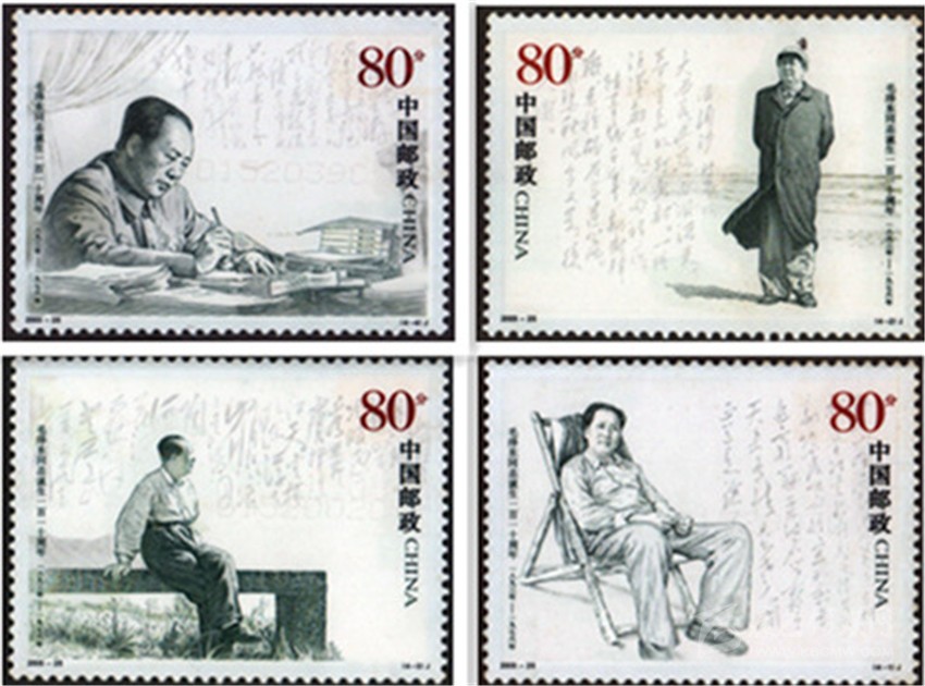 2003年126, 中國郵政發(fā)行《毛澤東同志誕生一百一十周年》紀(jì)念郵票一套4枚,分別表現(xiàn)了毛澤東在西柏坡、毛澤東在北戴河、毛澤東在廬山、毛澤東在廣州的不同形象,背景以相應(yīng)的毛澤東詩詞書法襯托,偉人的豐姿躍然票上。這套以照片為基礎(chǔ)采用膠雕套印大票面黑白兩色的郵票,樸素大方,典雅大氣。郵票中的人物形象從面部表情到坐立姿態(tài),都顯出神采奕奕、栩栩如生。