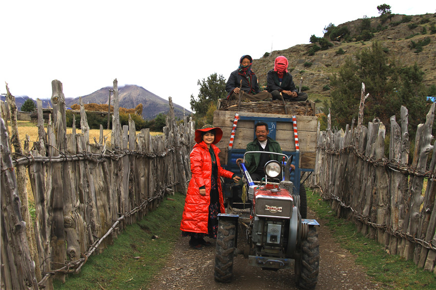不久雨停下來,山邊露出一縷陽光,天空又是一片碧藍。我們趕緊繞道藍湖驛站后面的牧場上,發(fā)現(xiàn)一座臨時搭建的軍用鐵橋可是通向一個小島。走過去,島上景色更美,遠處雪山冰川倒影晶瑩碧藍的水中,近處綠樹滿山,草場上牛羊星星點點。島上的小村莊叫阿日村,住著十幾戶人家,青稞剛收獲完畢,男人正忙著把牛羊過冬的草料堆積在高高的木架子上,女人除了撿牛糞外,還要準備冬天取暖的柴薪。雖然村民大多不能講漢語,但對陌生人通常會含笑致意,一個小伙子還用結(jié)結(jié)巴巴的漢語重復了兩遍“喝不,青稞酒?”。我們到村民達娃卓瑪家,她是家里四個孩子中的老大,今年二十二歲,最小的弟弟不到五歲。她上過三年小學,能講一點漢語,臨時充當家人的翻譯。父母和奶奶見有客人來,非常熱情,立馬打酥油茶,并端上一盤奶渣,因為不會講漢語,只好不停招呼我們“吃,多吃”。家里的客堂兼經(jīng)堂寬敞干凈,廊柱和供案施以彩繪,供案上擺放兩個活佛的一尺見方的照片,前排供了酥油燈、糌粑和清水。