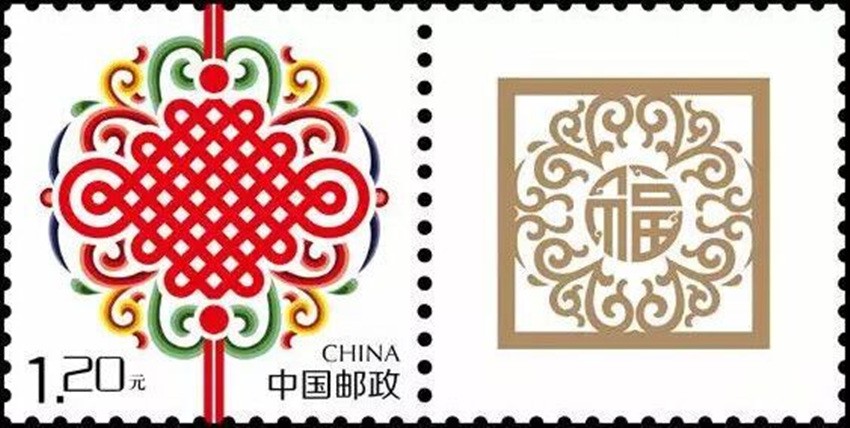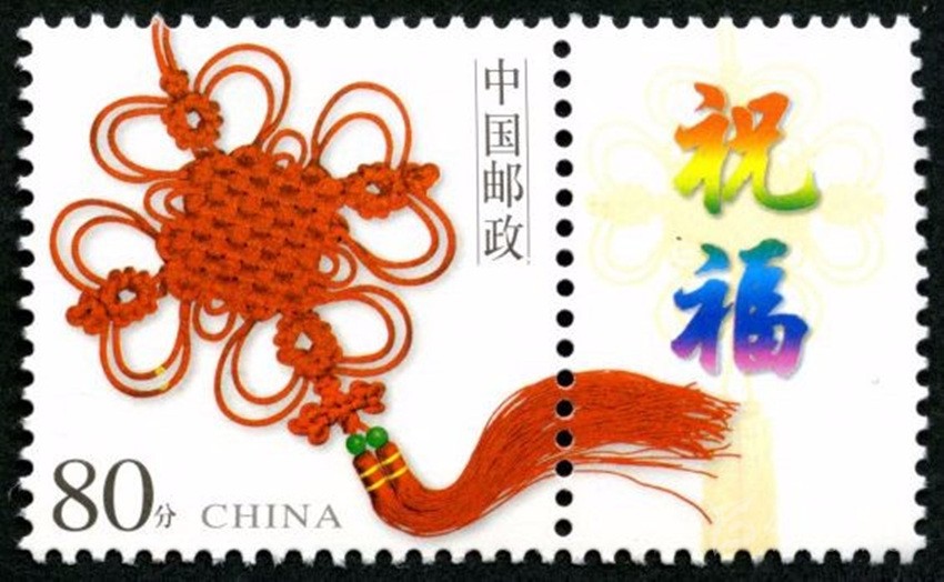 2002年5月10日,中國郵政發(fā)行《如意》個性化服務(wù)專用郵票一枚。主票圖案為如意柄端系著一個紅色“中國結(jié)”,附票有“祝?!倍郑?2003年3月3日,中國郵政發(fā)行《同心結(jié)》個性化服務(wù)專用郵票一枚。主票圖案為盤長結(jié)4邊編織有心型繩結(jié)的同心結(jié),附票為“祝?!倍?;2006年9月25日,中國郵政發(fā)行《中華全國歸國華僑聯(lián)合會成立五十周年》紀念郵票一枚。圖案為阿拉伯數(shù)字“5”與中華全國歸國華僑聯(lián)合會圓形會徽組成數(shù)字“50”,象征全國僑聯(lián)五十周年,背景畫面為淡淡的粉紅色“中國結(jié)”。寓意歸國華僑與全國人民血肉相連,同心同德共同建設(shè)美好家園;2013年8月8日,中國郵政發(fā)行一枚《美好祝福》賀卡專用郵票,圖案為象征喜慶的紅色“中國結(jié)”;2014年9月20日,中國郵政發(fā)行《中國夢(二)——民族振興》特種郵票,其中第四枚“民族團結(jié)”,圖案中載歌載舞的各民族群眾上方有一個大紅的“中國結(jié)”,象征著各民族大團結(jié)。