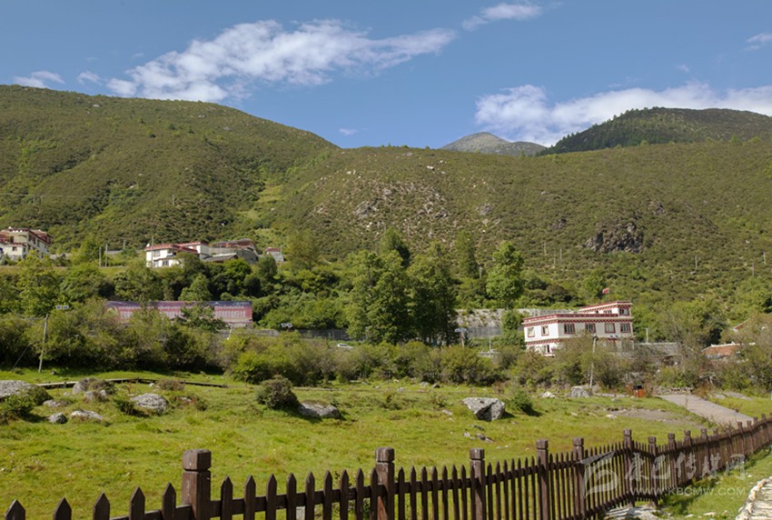 折多塘村房舍現(xiàn)多數(shù)沿公路兩側筑建。其實沒通公路前,山間馱道應是村后呈椅狀的一片草坡上。草坡邊自古就有的一方露天溫泉池塘水霧彌漫,熱氣蒸騰,正應了前人所記“山凹有熱泉沸起”、“憇啞池塘,帳宿于折多”;且在舊時馭馬馱牛的行旅中宿棧,這寬大的草坪方適合繃搭帳蓬和放牧牲畜,露天溫泉又可洗濯行旅之勞頓。