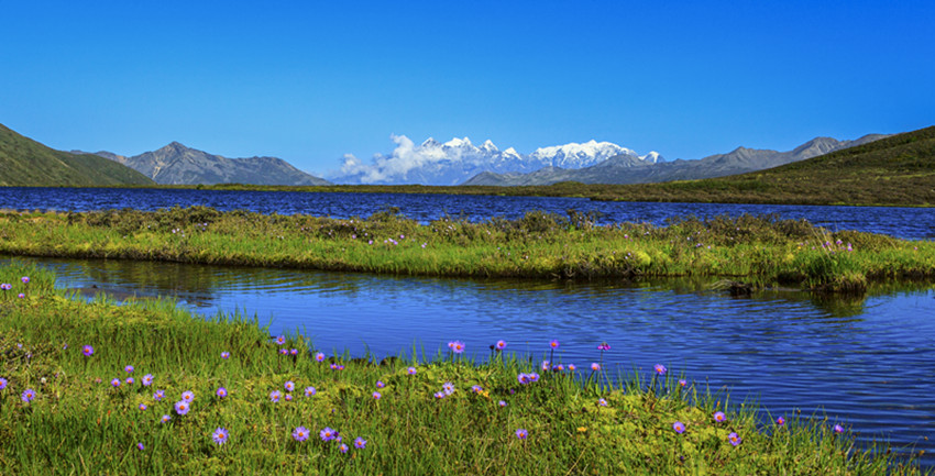 在山谷中穿行十余公里,路面一點(diǎn)點(diǎn)抬起,上了貢嘎山脈,徑直進(jìn)入康定情歌景區(qū)。隨著海拔的升高,涼意漸濃。山依舊是主角,地勢(shì)卻變得平緩而開(kāi)闊,有茵茵的草地,有大小湖泊,沿途山泉潺潺,野花點(diǎn)綴,空氣清幽,方才單調(diào)的褐色很快被淡忘。山體漸次出現(xiàn)密集而低矮的灌木,枝條筆直地立著,有高寒山區(qū)的凜然之氣。灌木一層層上延,樹(shù)木雜多,大片的原始森林漫過(guò)山體,將大山包裹起來(lái)。遠(yuǎn)處,藍(lán)天白云之下,貢嘎雪山在群峰中探出頭來(lái),擦亮高空的陽(yáng)光。澄明的空氣里,仿佛可以聽(tīng)見(jiàn)雪??┛┑匦Αx那間,仿佛所有的大山,都開(kāi)始舒展筋骨。