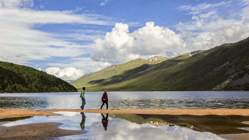 木格措特殊的位置和完好的生態(tài),造就了“一日四時(shí)景、早晚不同天”的自然奇觀。高原的第一縷晨光越過(guò)遠(yuǎn)峰,均勻地鋪灑在木格措湖面,湖水蘇醒過(guò)來(lái),水面煙波浩渺,薄紗飛卷,如同早起后對(duì)鏡梳妝的仙女。午后有微風(fēng),遠(yuǎn)處湖面靜若處子,近前卻有微瀾拂岸,動(dòng)靜之間,盡得自然自在。斜陽(yáng)西下,余暉投灑在水面上,湖水濃墨重彩,任意涂抹,水天一體,你我也融合在靜謐的湖光夜色中了。