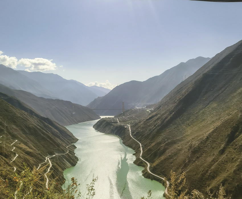 在瓦斯溝河口,折多河匯入了大渡河,更加寬闊的河面,在陽(yáng)光的照耀下,泛著波光,冬天的河水是溫潤(rùn)的綠色,國(guó)道318線沿著大渡河行走,不時(shí)有村莊散落在路兩旁。