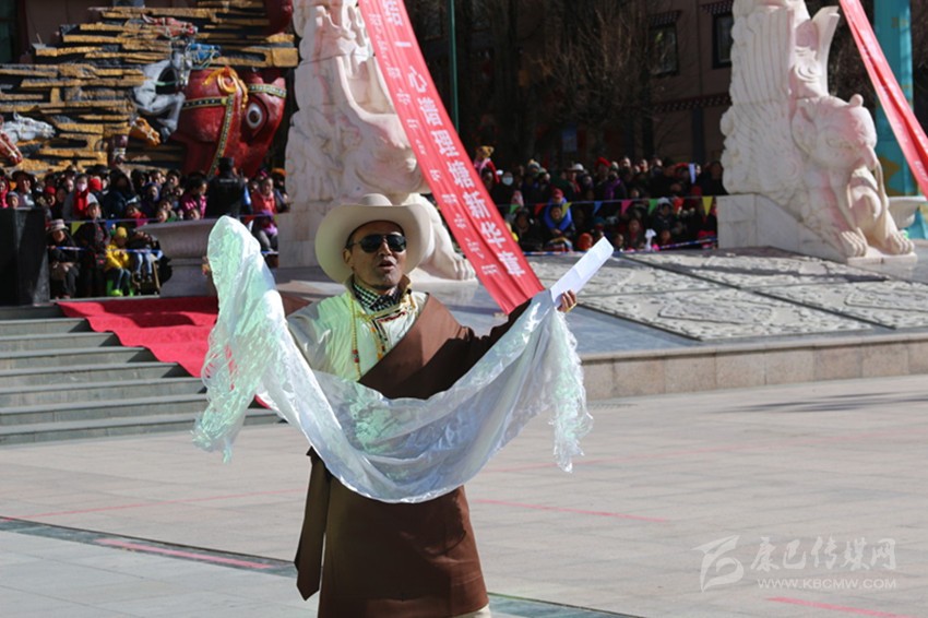 吉祥頌,藏語稱為“協(xié)巴”,是州級非物質(zhì)文化遺產(chǎn)之一?!皡f(xié)巴”在藏族民間生活中占有重要的地位,尤其在喜慶活動上,是一項(xiàng)不可或缺的重要儀式。州級非物質(zhì)文化遺產(chǎn)傳承人——高城鎮(zhèn)車馬村的翁堆老人手捧潔白的哈達(dá),為觀眾表演了《協(xié)巴——中國夢、理塘夢》,展現(xiàn)了時(shí)代變遷中,“吉祥頌”這一民間藝術(shù)在思想內(nèi)容和藝術(shù)手法的創(chuàng)新之美。