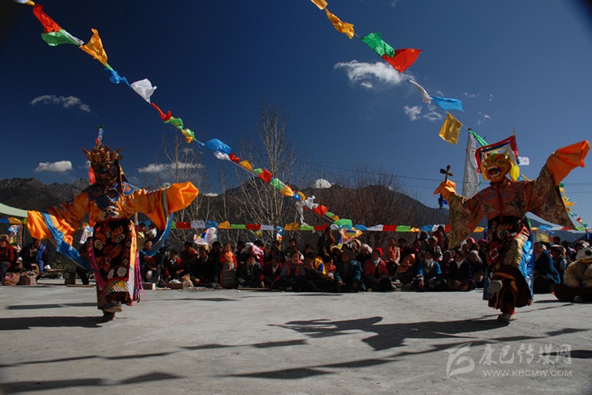 康巴藏傳佛教各派每年冬春都要舉行面具不同、內(nèi)容各異的跳神祭祀活動,規(guī)模最大的數(shù)德格縣更慶寺的普巴多吉——《金剛撅童子》跳神。這一活動于藏歷每年元月中旬舉行,由僧人演出,連續(xù)兩天,是歷時十天的佛事活動的組成部分。屆時群眾從四面八方絡繹而至,上萬人匯聚于大壩爭相觀看,場面十分壯觀。