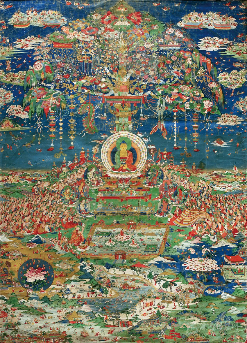 具有超越凡人的精微刻畫能力,也使得郎卡杰在面對畫布時,有更廣大的空間來展示他的繪畫天賦。從存世的作品《無量光佛凈土》中,看得出郎卡杰喜歡將自己的“毫毛畫師”的能力發(fā)揮到極致。不管是花紋、瓔珞、還是人物,但凡是畫面上出現(xiàn)的物象,他都會以精致、繁密的形式出現(xiàn)。所以他的畫面世界里往往都是人山人海、琳瑯滿目;盈寸之間,容納萬千;場面浩瀚、氣勢恢宏、不可思議!