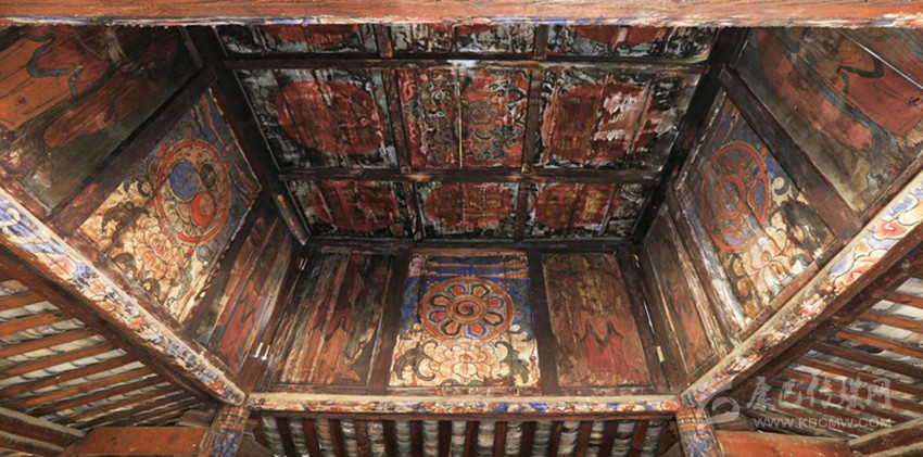 在介紹的過程中,我發(fā)現(xiàn)這座小寺不簡單,很想到正殿看看。到了殿里,我發(fā)現(xiàn)殿內(nèi)佛像具備,壁畫、板畫以及唐卡數(shù)量眾多,皆是工藝精湛。廟宇四檐有青銅制風(fēng)鈴4個(gè),但是一樓的壁畫看著像是維修過。