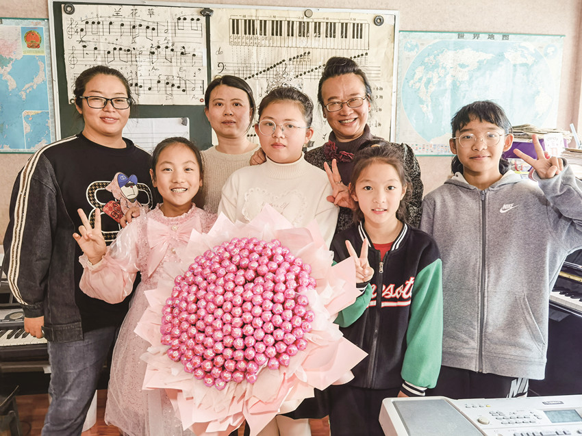 獲得榮譽(yù)后,肖欣蕊和老師、同學(xué)分享快樂。 受訪者 供圖