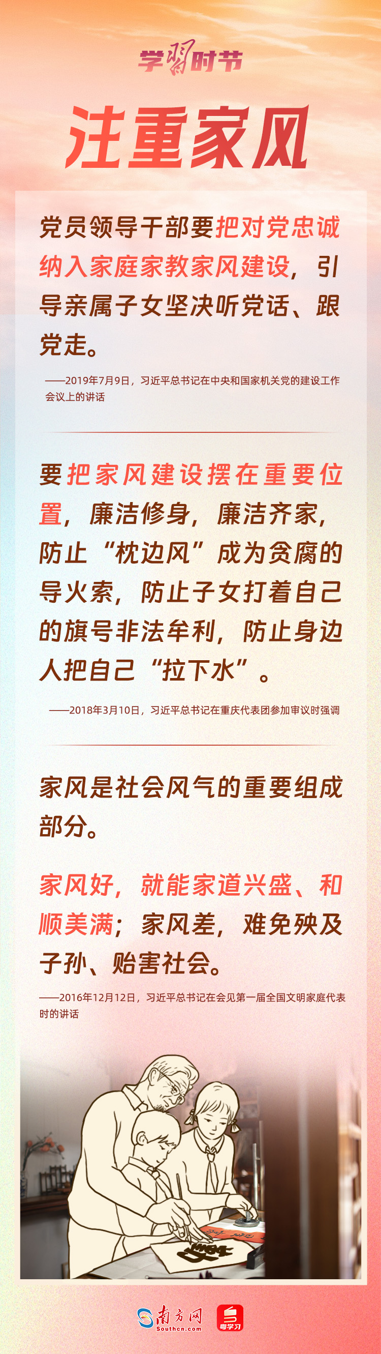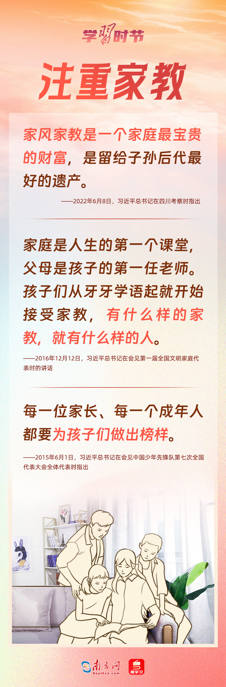 5月15日是國際家庭日。家庭是社會的細(xì)胞,是國家發(fā)展、民族進(jìn)步、社會和諧的重要基點(diǎn)。習(xí)近平總書記心中始終牽掛著千家萬戶,高度重視家庭、家教和家風(fēng)建設(shè),強(qiáng)調(diào)不論時代發(fā)生多大變化,不論生活格局發(fā)生多大變化,我們都要重視家庭建設(shè),注重家庭、注重家教、注重家風(fēng)。家庭和睦、家教良好、家風(fēng)端正,子女才能健康成長,社會才能健康發(fā)展。